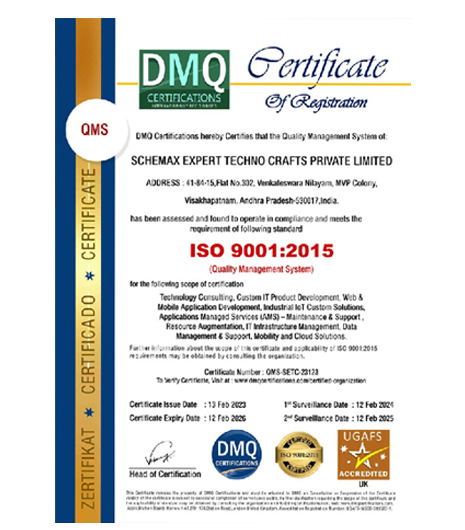 Schemax proudly holds ISO 9001:2015 certification, demonstrating our commitment to maintaining high standards of quality and security. This internationally recognized standard is a testament to our rigorous processes and dedication to delivering exceptional products and services to our clients. By adhering to ISO 9001:2015 requirements, we ensure that our operations are efficient, our products are reliable, and our customers receive consistent satisfaction.